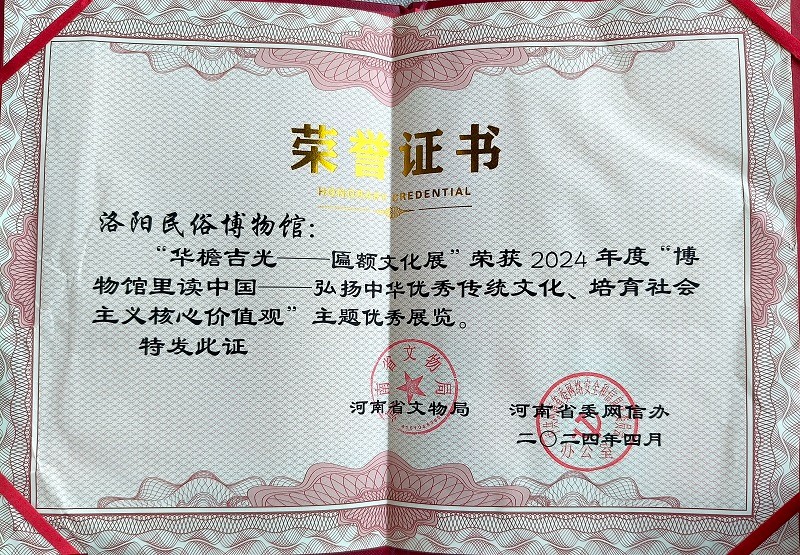 继“镜像——家风家训专题展”入选2023年度“弘扬中华优秀传统文化、培育社会主义核心价值观”主题展览推介项目之后,今年洛阳民俗博物馆再获荣誉。作为文化遗产的守护者,我们将不负众望、再接再厉,做好文物的保护利用和研究阐释,使之成为涵养社会主义核心价值观的源头活水,更好地发挥博物馆在传承文明、服务社会、促进发展中的作用,让更多的人走进博物馆,感受中华优秀传统文化的魅力。