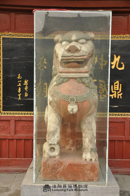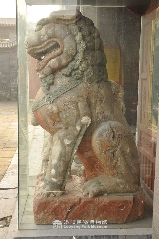 明福王府汉白玉彩绘石狮,现陈列于洛阳民俗博物馆院内。该石狮蹲踞于长方体汉白玉底座之上,阔口瞠目、舌尖上卷,胯下有雄性器官。其左前肢直立于底座,右前肢按抚一幼狮,但幼狮的头部已经缺失,仅可见榫结圆孔,背部还俯一小狮子呈戏耍状。石狮本体和底座均采用整块汉白玉,其造型主要是以透雕、高浮雕和圆雕等手法雕刻而成,雕工精湛。颈下项圈以线雕手法刻有吉祥花卉图案,项圈中央以圆雕手法雕刻一铃铛,玲珑精致,狮爪的每个趾节都清晰可见,栩栩如生。石狮造型生动威武,纹饰清晰剔透,刀工细腻圆润。