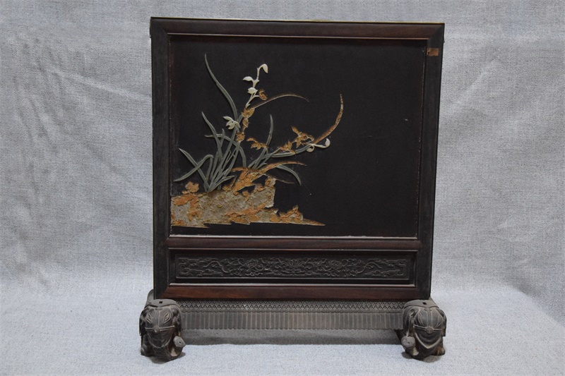 插屏正面屏文为乾隆《鸡雏待饲图》题跋,系用名贵上好的青白玉雕刻镶嵌于屏心,隶书,每个字约1公分见方。诗文右侧以玉石雕刻两只鸡雏,取材于南宋李迪的《鸡雏待饲图》。雏鸡一卧一立,面朝同一方向,屏气凝神,仿佛听见母亲觅食的召唤,正欲奔去。画面构图简洁、传神,将雏鸡嗷嗷待哺的情态表现得淋漓尽致。反面屏心为兰草图,黑色背景底色,以绿色玉石雕琢成兰草的枝叶,以白玉雕琢成兰花后镶嵌于屏心,兰草枝叶长度不一,给人以随风摇曳的动感。插屏正面边框浮雕蝙蝠、“寿”字、如意云纹等吉祥寓意纹饰,插屏下部的绦条板雕刻夔龙纹、西番莲纹花,立体感强。屏座双头象座,象身上雕刻佛教常见的宝珠垂幔,象鼻均弯曲上卷,象鼻上的皱褶、鼻孔及眉眼清晰可见,雕工精细,造型典雅。
