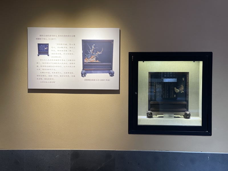 清乾隆御制《鸡雏待饲图》诗文插屏,现陈列于洛阳契约文书博物馆。高0.63米,宽0.58米,厚0.025米。插屏由座和屏两部分组成,双面屏心,边框和插座材质均为紫檀木。